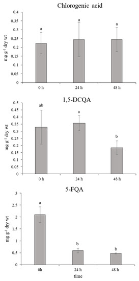 Unpublished results obtained from the UV experiment showed a significant decrease in 5-FQA content through the 48 h (Figure A2). Considering the quinic acid derivatives content changes and after the stress, with the statement of higher antioxidant capacity of caffeoyl derivatives, support the hypothesis of physiological function of 5-FQA as a native storage form of the quinic acid derivatives in chamomile plants.
