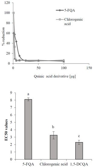 One possible explanation for the enhanced accumulation of caffeoylquinic derivatives in conditions of higher ROS concentration induced by ethephon or UV-B radiation could be their better antioxidant potential in comparison with feruloyl derivatives. Kono et al. [32] declared substantial antioxidant properties of the chlorogenic acid (3-caffeoylquinic acid), and Chan et al. [33] proved the higher effectivity of caffeoylquinic acids to scavenge free radicals than any other phenols. Testing 16 different phenolic compounds, including caffeic and ferulic acids, on the DPPH scavenging activity showed higher effectiveness of caffeic acid to scavenge radicals than ferulic acid [34]. It could be supposed that chlorogenic acids with a higher number of caffeoyl groups could prove a more significant antioxidative capacity and reactivity, and physiological efficacy than feruloyl derivatives. This assumption was demonstrated in the DPPH testing of the antioxidative capacity of standards of chlorogenic acid derivatives confirmed in chamomile plants and isolated 5-FQA (Figure 7). The DPPH assay is widely used to evaluate the free radical scavenging effectiveness, which is the antioxidant activity of various substances. It is expressed as a percentage of reduction of DPPH radicals by testing substances or as an EC50 value, which is the concentration of the extract determining a 50% decrease of absorbance of the DPPH solution [35]. From our results (Figure 7), the highest EC50 value showed 5-FQA, but it reflected the lowest antioxidative capacity (AC) in comparison with the AC of chlorogenic acid and 1,5-DCQA. Yang et al. [36] obtained similar results, which showed a higher AC of metabolites with the caffeoyl group presented in the molecule than these containing only feruloyl. Moreover, they concluded that the antioxidant activity is determined not only by the number of phenolic OH-groups, but also by their position in the aromatic rings. Compounds exhibiting vicinal OH-groups on the aromatic rings, such as dihydrocaffeic acid, are particularly potent antioxidants.