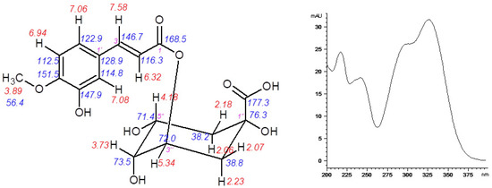Structure of the isolated 5-O-feruloylquinic acid together with 1H and 13C-NMR chemical shifts (left) and UV spectrum (right).