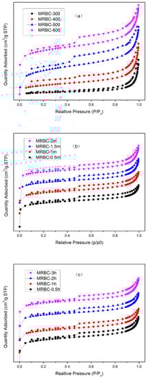 The nitrogen adsorption/desorption curves of biochar prepared at different conditions: (a) pyrolysis temperature; (b) MgCl2 impregnation concentration; (c) pyrolysis time.