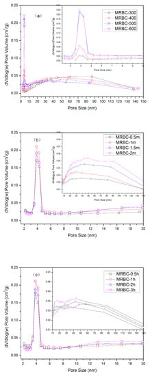 The pore structure distribution of MgO-modified biochars prepared at different pyrolysis temperatures, impregnation concentrations and pyrolysis times are shown in the Figure 2. MRBC-2 m has the lowest number micropores of the MgCl2-modified biochar at different concentrations, which was due to the blockage of excessive MgO nanoparticles acting on the pore structure of biochar [35]. The pore size distribution curves of the modified biochar at different temperatures were basically similar, but the pore size distribution in the range of 3–5 nm showed obvious growth changes with the increase of temperature. The pore structure is mainly dominated by smaller mesopores. However, the pore size distribution in the range of 30 nm to 150 nm is higher for MRBC-300 and MRBC-400 than for MRBC-500 and MRBC-600, indicating that high temperature was more conducive to the generation of smaller mesopores, while low and medium temperatures were conducive to the formation of larger mesopores or large pores. The different pyrolysis time for the different pore size distributions were basically similar and without significant change patterns, indicating that the pyrolysis time had no significant effect on the evolution of the generation of MgO-modified biochar pore structure. The pore size region below 6 nm has a narrower distribution, while the medium and large pores above 6 nm have a wider distribution. As the MgCl2 impregnation concentration increased, the pore structure distribution of the modified biochar showed an increasing trend in the range of 8–140 nm, indicating that changing the impregnation concentration contributed to the generation of more mesopores and fewer macropores. This may be due to the fact that the increase of impregnation concentration increased the MgCl2 loading on the surface and pores of the biochar, and more pyrolysis reactions occurred on the surface of the biochar under high temperature, which resulted in the generation of rich pore structure.
