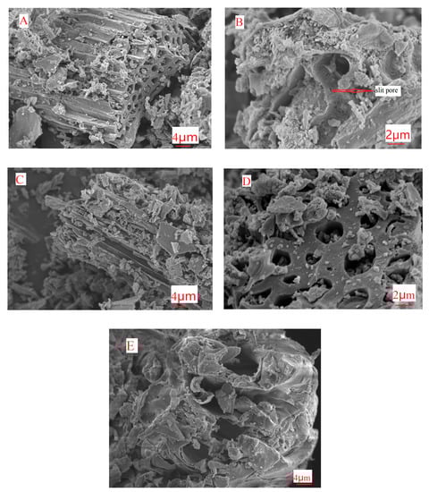 Scanning Electron Microscope (SEM) can be used to analyze the microstructures of biochar at the microscopic scale, which can directly reflect the surface morphology and structure characteristics of biochar. As a result that the surface structure of modified biochar is similar in general at different pyrolysis temperatures, holding time and impregnation concentration, only SEM images at different multiples were selected for analysis. It can be seen from the SEM scanning images (Figure 3) that there are pores of different pore sizes on the surface of the MRBCs, including slit pores and columnar pores, etc. In contrast, the surface of RBC-300 does not produce more pore structure. This conclusion was consistent with the nitrogen adsorption-desorption curve and the hysteretic loop type analysis results in the previous paper. In addition, the original skeleton structure of MRBCs can be maintained at higher pyrolysis temperatures. Furthermore, fine particulate matter can be found on the surface, cracks and pores of MRBCs, which may be the oxide of magnesium.