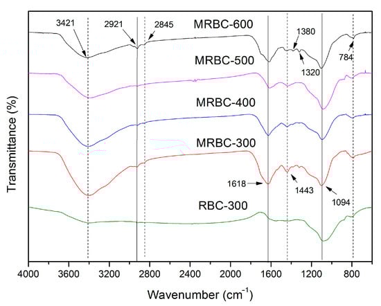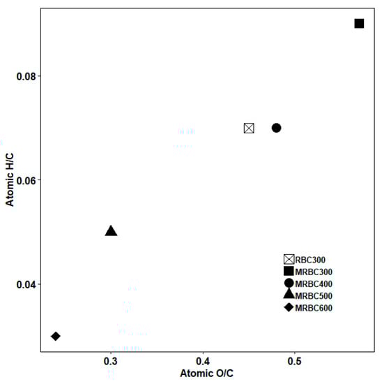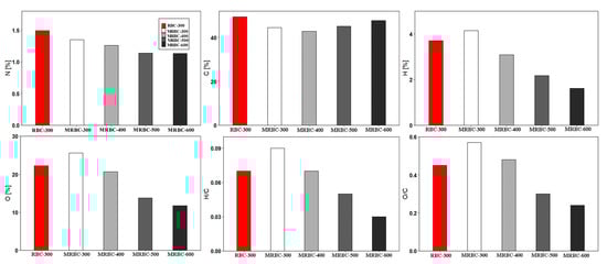 Figure 6 shows the elementary compositions of MRBCs and RBC obtained from rice straw at carbonization temperatures of 300, 400, 500 and 600 °C. It is noteworthy that the trend in the elemental carbon contents decreased from 300 to 400 °C and increased from 400 to 600 °C. The phenomenon is due to the cellulose and hemicellulose reacted violently to produce volatile products at 300 to 400 °C, while the increase in the rate of carbonization as well as the development of aromatic carbon structures 400 to 600 °C. From Figure 6, it can be seen that the H, N and O contents of MRBC decreased with the increase of production temperature due to the loss of volatile components and dehydration of organic compounds as well as the cleavage of weak bonds within the feedstock structure [44]. The H, N and O contents decrease with increasing pyrolysis temperature with a range of 1.61–4.15%, 1.13–1.35% and 11.7–25.6%, respectively. Reduction in the oxygen content indicates the removal of carboxylic functional groups and the formation of aromatic ring structures with higher carbonization [45]. This is due to the dissipation of the functional groups containing hydrogen or oxygen [13]. In addition, the H/C and O/C ratio of biochar can reflect its aromaticity and polarity to some extent [46]. When the carbonization temperature was further increased to 600 °C, the hydrogen-carbon and oxygen-carbon atomic ratio both decreased, reflecting the enhanced aromaticity and weakened polarity of the biochar. This indicates the formation of aromatic compounds and a decrease in the content of polar compounds in the biochar at increased temperature [28]. Furthermore, the higher oxygen-carbon ratio in the MRBC surface might imply that the MRBC surface contains more abundant oxygen-containing functional groups, and thus the biochar exhibits higher hydrophilicity and polarity [47]. The trends of elemental composition and atomic ratios with increasing pyrolysis temperature were in accordance with the previous studies [48,49].