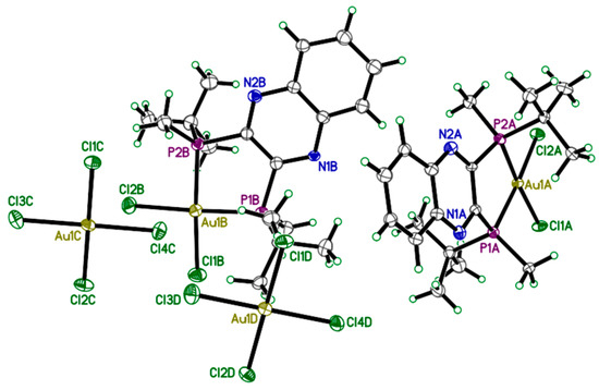 Crystals of 2 were grown by slow diffusion of ether into a concentrated DCM solution of gold complex and analyzed by X-ray diffraction. The unique structure of 2 which occurs as the S,S-QuinoxP* ligand reacts with two molar equivalents of HAuCl4·3H2O (Scheme 1) crystallizes as a monocationic complex in a triclinic crystal system with P1 space group (Figure 2). The X-ray structure of 2 reveals a C2-symmetric square-planar geometry around the gold centre, with two t-butylmethyl phosphine groups from the QuinoxP* ligand and two chloride ligands from HAuCl4·3H2O defining the d8 Au(III) geometry, as shown in Figure 2. The bond length (Table 1) of the Au-P bond is Au1A-P2A: 2.292(6) Å and Au1A-P1A: 2.298(6) Å, while the Au-Cl bond is Au1A-Cl2A: 2.320(6) Å and Au1A-Cl1A: 2.327(6) Å. The bond angle for the P2A-Au1A-P1A is 89.4(2)° and Cl2A-Au1A-Cl1A is 91.8(2), indicating a square planar geometry. The stereochemistry was determined by placing the ellipsoid diagram of complex 2 in the plane using the Mercury program [41]. The X-ray Parameters of 2 is shown in Table 2.
