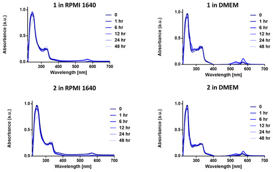 We first carried out stability studies on 1 and 2 in two biological media—Dulbecco’s modified eagle medium (DMEM) and Roswell Park Memorial Institute-1640 (RPMI-1640); both DMEM and RPMI-1640 contains large amount of amino acids, glucose, and other biological nucleophiles. This is important as anticancer drugs should be stable and not decompose before reaching their intracellular targets. Gold complexes, in particular Au(III) complexes, are highly susceptible to reduction by biological nucleophiles [42,43,44], especially cysteine containing residues. The stability of complexes in biological medium is pertinent to the efficacy and longevity of the chemotherapeutic in question [44]. The two complexes (1 and 2) were observed for a period of 48 h in biological buffer solutions at 37 °C to mimic the body temperature. Both 1 and 2 exhibited great stability in both DMEM and RPMI-1640 over the course of the experiment (Figure 3). Given that most complexes are cleared within 60–80 min [45], the relative high stability of these complexes makes them a great framework for gold(III) chemotherapeutic development. The high-energy bands and intense absorption observed in the UV–vis spectra of 1 and 2 in RPMI at 247 and 322 nm may be attributed to the ligand-to-metal charge transfer (LMCT) or metal-to-ligand charge-transfer (MLCT) character of the Au(III) center. There was no change in the absorption profile of 1 or 2 in RPMI 1640 and a slight change in DMEM. The stability of 1 and 2 in RPMI can be attributed to the Au-P bonds that enhance sigma-donation to the gold center. The slight hump at 568 nm in the spectra of 1 and 2 in DMEM can be attributed to displacement of the chloride in 1 and 2 by some amino acids in DMEM.