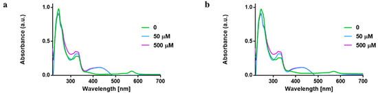 Next, we monitored the reaction of 1 and 2 with cysteine thiols using L-Glutathione (GSH) at different concentrations (0, 50 and 500 µM) via UV–vis spectrophotometry. Reactions of gold complexes with amino acids and other biological nucleophiles are well documented [43,46,47,48]. For example, organogold(III) compounds have been found to undergo reduction at the gold center when reacted with protein hen egg white lysozyme (HEWL) [43]. Additionally, activation of the gold center is believed to take place via the displacement of the labile chloride atom without alteration of the overall complex [47]. Further, Au(III) dithiocarbamates have also been studied and they are rapidly reduced in the presence of biological nucleophiles, which limit their application [49,50].