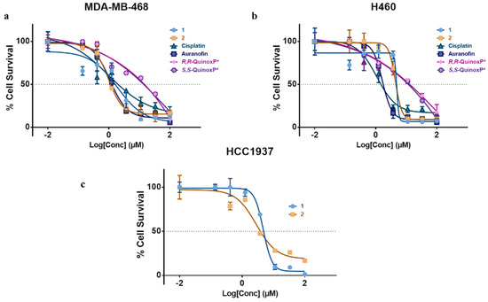 The cell viabilities of 1 and 2, were determined in MDA-MB-468, H460 and HCC1937. Additionally, cisplatin, auranofin and both S,S and R,R-QuinoxP* were determined in MDA-MB-468 and H460. Cells were grown to confluency and trypsin was added to detach and harvest cells. The cells were washed with 2 mL of PBS and suspended in 10 mL of the appropriate media. The cells were centrifuged at 2000 rpm for 5 min and the pellet washed with 2 mL of PBS then suspended in 5 mL of the appropriate media. The cells were plated at a density of 2000 cells/well in a 96-well clear bottom plate and allowed to adhere overnight at 37 °C with 5–10% CO2. The compounds were prepared as a stock in DMSO and used fresh. The compounds were added at seven concentrations with a 3× serial dilution starting at 50 µM for the highest concentration and incubated at 37 °C for 72 h with 5–10% CO2. The cells were fixed with 1% glutaraldehyde (in PBS) and staining with 0.5% crystal violet, as previously described [15]. The plates were read using a Genios plate reader (λ = 570 nm). The experiment was performed in triplicate and data are plotted as the mean ± s.e.m. (n = 3).