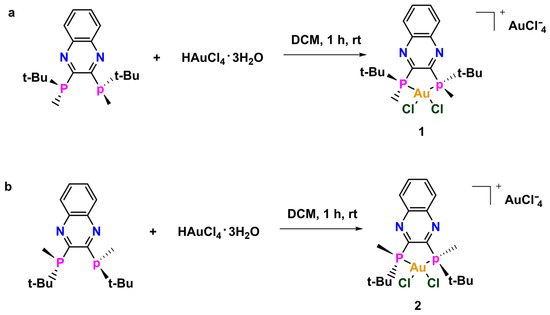 Compounds 1 and 2 were synthesized by stirring the corresponding QuinoxP* with HAuCl4·3H2O in dichloromethane. The initial brick red color gradually changed to light yellow over the course of the reaction. The compounds were both precipitated from a concentrated DCM solution with excess Et2O to afford the yellow solids in good yields (Scheme 1). The compounds were characterized by 1H NMR, 13C NMR, 31P NMR, high-resolution mass spectrometry (HRMS) and the purity was ascertained by elemental analysis (EA). The structure of 2 was further confirmed by X-ray crystallography, indicating that a monocation complex was formed. At the onset, we hypothesized that the biological activities of the two chiral compounds will be different because building blocks (e.g., amino acids) in living systems themselves are chiral and each enantiomer of a chiral complex can behave in different ways due to potentially variant complex–protein interactions. Given the scarcity of chiral bisphosphine gold complexes used in biology and to build on our initial studies [14,15] in this area, we envisaged that changing the stoichiometric ratio of the reactant could lead to structures with unique geometries. The unique geometry discussed in this research provides more opportunity for an expanded library of compounds and can also serve different applications in both biological and electronic systems.
