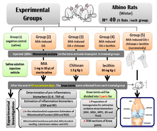 The OA + chitosan rats were injected with MIA as previously mentioned, before being treated orally with chitosan at 1.5 g/Kg [20]. The OA + lecithin rats were injected with MIA and then treated orally with lecithin at a dose of 90 mg/Kg [21]. The final treated group (OA + chitosan + lecithin) was injected with MIA and then treated with both chitosan and lecithin, each at the doses described previously. The experimental period continued for 45 successive days. After the end of the experiment, All the rats were sacrificed under light anesthesia with ketamine/xylazine. Efforts were made to reduce the stress and pain of the rats; then, the knee joints (from the two knees of the rat) were divided into three parts. The first part was used for TEM sections, the second part for preparation of a mitochondrial suspension for measuring the bio-functional parameters of the mitochondria, and the third part was used for estimation of oxidative stress enzymatic and non-enzymatic parameters, as shown in Figure 1, which clarifies the experimental protocol.