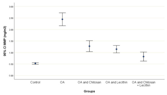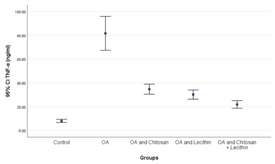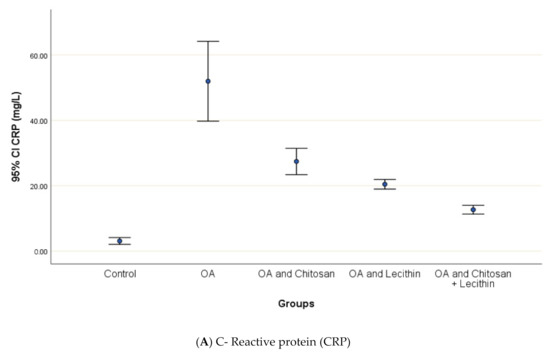 A lecithin formulation with some standardized natural extracts had a distinguished and marked effect on reducing the knee OA symptoms (both pain and knee function), due to the anti-inflammatory activity showed by a reduction of inflammation markers (CRP) [53], similar to the results obtained in our current study for the OA group treated with Lecithin, with a greater reduction in inflammatory markers in the case of treatment with both chitosan and lecithin. These results are very interesting, novel and appealing, and so we can hypothesize that the decrease of pain and the improvement of the knee function in the case of treatment of OA animals with both Chitosan and lecithin demonstrates their synergistic effect in the alleviation of OA pain.