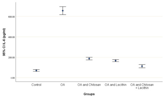 TNF-α and IL-6 levels were revealed in serum at the end of the experiment after injection with MIA (Figure 2 and Figure 3). The levels of TNF-α and IL-6 were elevated markedly in the control OA treated group, as compared to those in the negative control groups. Chitosan and lecithin both suppressed TNF-α levels, while the combination of both decreased the TNF-α level. Chitosan, lecithin, and the two in combination decreased IL-6 levels as compared to the positive OA control treated group.