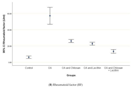 The efficacy of chitosan and lecithin against: (A) C-reactive protein (CRP) and (B) rheumatoid factor (RF) of (OA) model that was induced by monoiodoacetate (MIA). The data presented as mean ± S. E.