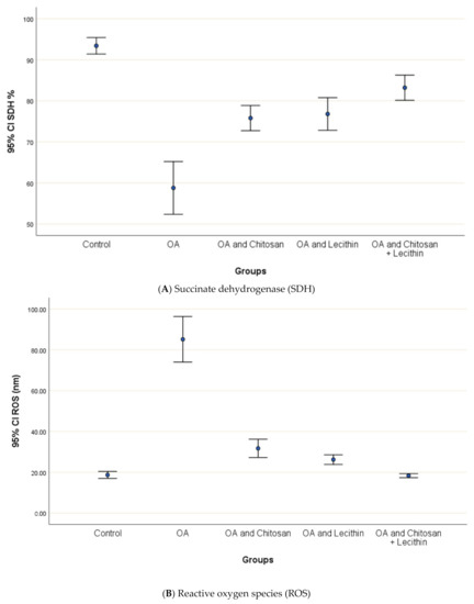 The levels of SDH, ROS and MMP were significantly elevated in OA group, as compared to those in negative control group (Figure 4). Treatment of the rats with chitosan, lecithin, or both significantly lowered the RF, as compared to the positive control group (MIA-induced OA).