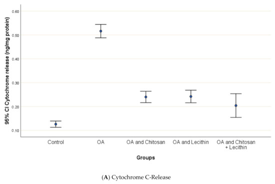 Cytochrome-c which is released from the mitochondria to the cytosolic part represent the first step in the cellular apoptosis, as to liberate a caspase cascade that inter the cells to the cellular death cycle. It has been reported that the mitochondrial matrix swelling triggered due to any stimuli that may cause apoptosis causes the major cytochrome-c discharge [68], and this parallels the current findings that cytochrome c levels were significantly elevated in OA control group.