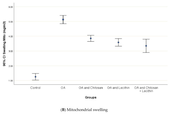 Osteoarthritis accelerated the mitochondrial swelling, as demonstrated in Figure 7, as it was significantly increased in MIA-induced OA as compared to the control group. The mitochondrial swelling was diminished significantly under the chitosan, lecithin, and the combination treatment, respectively.