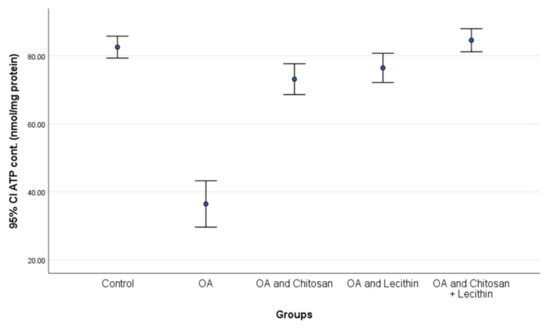 Positive control rats had a lower ATP content (55.8%) compared to negative control rats (Figure 8). The treatment with chitosan elevated the ATP content significantly as compared to OA rats, and the lecithin treatment elevated ATP content significantly. The chitosan + lecithin combination treatment lead to a significantly greater ATP content as compared to OA group than either treatment administered in isolation.
