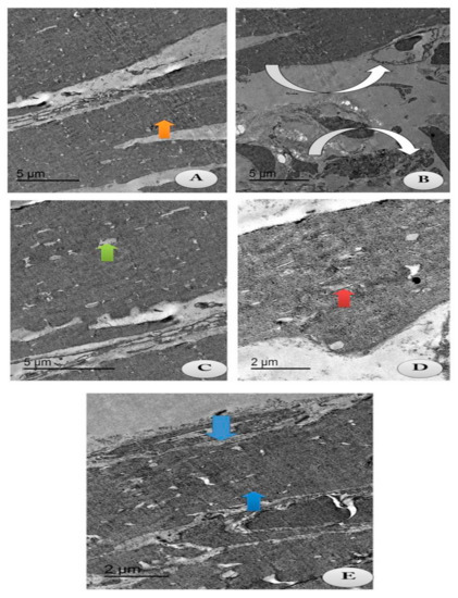 Knee joint portions were dissected and TEM sections were examined by fixing the samples in 2.5% glutaraldehyde and then, embedding them in resins [33]. Specimen block was cut into ultrathin sections (0.05 mm), and then the sections were stained with uranyl acetate for 1 h and then, stained with lead citrate for about 15 min. Knee joint sections were examined under a transmission electron microscope unit (JEOL, Akishima, Tokyo, Japan, 12,000× magnification) at Mansoura University, Faculty of Agriculture, Mansoura, Egypt.