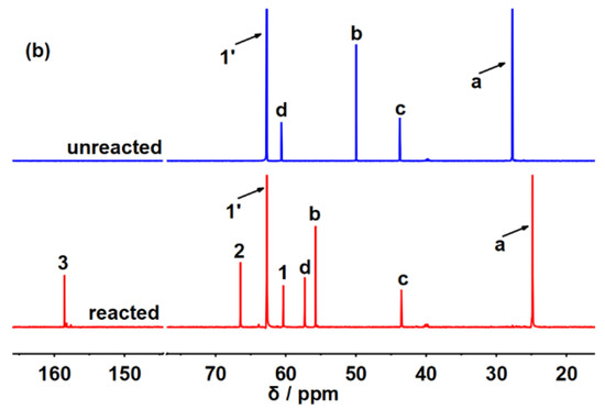 It is reasonable to anticipate that the proton of the OH group of TBAE can transfer to the amino group by forming zwitterionic species (CH3)3-C-N+(H2)-CH2-CH2-O− in TBAE-EG absorbent, which may react with CO2 to form zwitterionic carbonates. However, NMR results did not show any signals of zwitterionic carbonates, suggesting that the reaction pathway forming zwitterionic carbonates was not preferable in the TBAE-EG system. In order to further confirm the reaction between CO2 and EG, we studied the reaction between CO2 and a nonaqueous solvent consisting of superbase 1,5-diazabicyclo [5.4.0]-5-undecene (DBU) and EG. As reported in the literature, CO2 reacted with the -OH group of alcohol when CO2 was absorbed by the DBU–alcohol mixtures [22]. The 1H and 13C NMR spectra of DBU solution (30 wt%) in EG before and after CO2 absorption were shown in Figure S1. There were two new peaks at 3.15 and 3.39 ppm in the 1H NMR spectra of DBU-EG after absorption (Figure S1a). Three new peaks appeared at 60.0 (C-1), 65.8 (C-2) and 157.9 (C-3) ppm in the 13C NMR after absorption (Figure S1b). These new peaks in the DBU-EG-CO2 system were consistent with those in the TBAE-EG-CO2 system, suggesting that CO2 reacted with EG. These results again suggested that the CO2 absorption mechanism of TBAE-EG presented in this work was understandable.