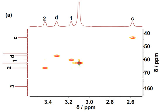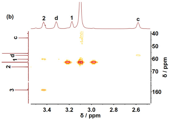 The 2D NMR spectra of TBAE-EG after CO2 absorption: (a) 1H-13C Heteronuclear Single Quantum Coherence (1H-13C HSQC); (b) 1H-13C Heteronuclear Multiple Bond Correlation (1H-13C HMBC).