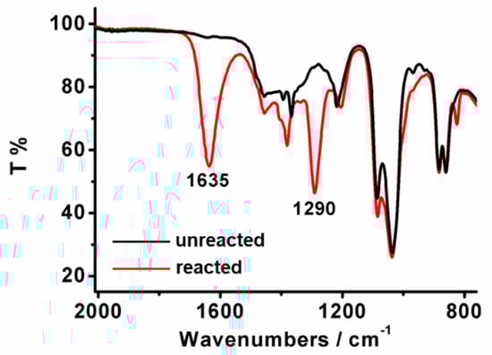 The FTIR spectra of the TBAE-EG system with and without CO2 were also studied. Two new peaks can be observed at 1635 and 1290 cm−1 (Figure 3), which can be ascribed to the asymmetric and symmetric carbonyl stretching frequency of C=O in R-O-COO− species [6]. However, the two peaks were different from those of TBAE-CO2 adduct (1641 and 1295 cm−1) reported by Im and co-authors [18], suggesting that CO2 was bonded to the O atom of EG, not the O atom of TBAE. Therefore, the FTIR results confirmed again the reaction between CO2 and -OH of EG.