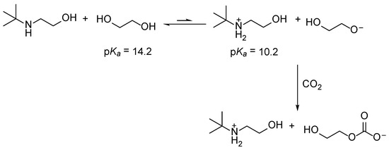 The reaction of CO2 with amine 2-[(1,1-dimethylethyl)amino]ethanol (TBAE) and ethylene glycol (EG).