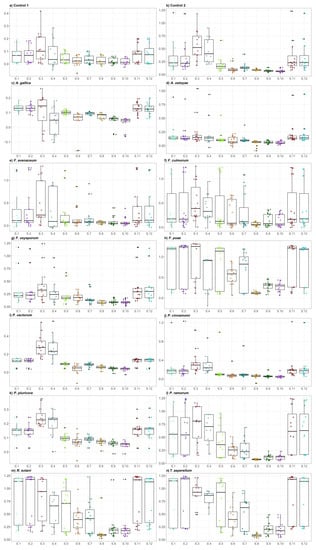 Distribution of the overall averaged values of gas detected by twelve differential sensor signals differed among all fourteen treatments (Figure 1). The two control treatments yielded somewhat divergent results because mean signal intensities obtained over four weeks of study showed clean empty glass flasks to be inducing a very weak response from e-nose sensors, whereas the potato dextrose agar (PDA) medium generated a stronger reaction from the sensing device on average (Figure 1a,b).
