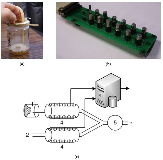 Representative view of the differential electronic nose apparatus. (a) Introduction of the air intake tube inside the sample; (b) Twelve chemical sensors in an array chamber; (c) General scheme of the e-nose principle of measurement: (1) Sample flask; (2) Ambient air; (3) Tested material; (4) Sensor chambers; (5) Inducting pump and flow-meter. Adapted from Brudzewski et al. [22], Osowski et al. [114].