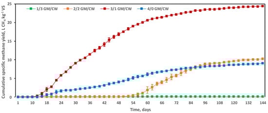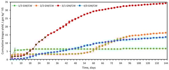 Cumulative biogas yield in the GM monodigestion digesters containing 4/0 GM/CW (w/w) were initially the lowest; performance later improved, reaching a cumulative 13.66 ± 0.1 L gas kg−1 VS (Figure 1).