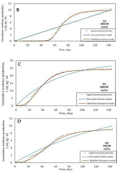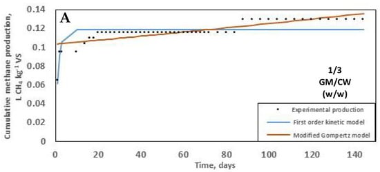 After a 10-day lag period, digesters containing 3/1 GM/CW (w/w) produced cumulative biogas of 34.24 ± 0.1 L gas kg−1 VS, exhibiting a predominantly monophasic curve (Figure 1).