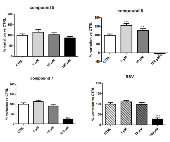 Dose-response effects of compounds (1–7) and RSV in C2C12 cells after 24 h. MTT reduction assay in C2C12 cells in the presence of (1–7) together with RSV. The cells were incubated with increasing concentrations of the compounds (1, 10, 100 µM) for 24 h. After this period, cell viability was quantified by measuring MTT reduction. CTRL: control, cells w/o compounds. Data are expressed as % variation vs CTRL. The means ± SEM derived from 3 different experiments (each with n = 8) and were analysed using unpaired t-tests. *** p < 0.0005, ** p < 0.001.