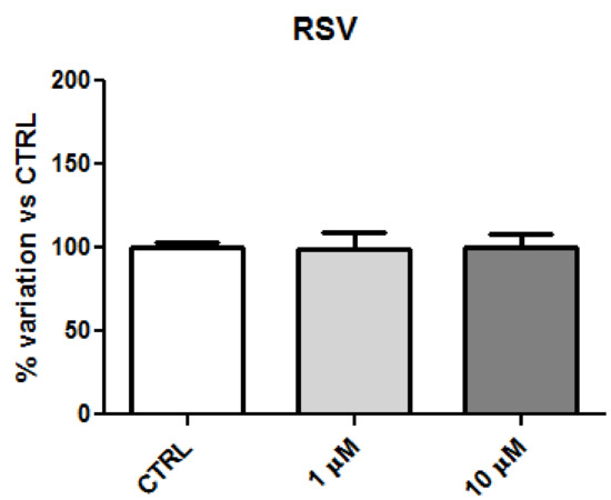 Cellular proliferation was tested using a colorimetric assay of 3-[4,5-dimethylthiazol-2-yl]-2,5-diphenyltetrazolium bromide (MTT). We seeded 2000 cells/well in a final volume of 200 μL growth medium in 96-well plates. After 24 h the cells were stimulated with or w/o the newly synthesized compounds for 24 h, or, where indicated, for 48 h. We tested seven new synthesized compounds together with RSV reference at different concentration (1, 10, 100 μM). All compounds were dissolved in DMSO and the experimental dilutions used were made using cellular growth medium. For this reason, the cells were also incubated for 24 h with the DMSO at the same concentration used for the compounds. Incubation was terminated by adding 20 μL of MTT solution (5 mg mL−1 in phosphate-buffered saline (PBS)) to each well, followed by incubation at 37 °C for 3 h in the dark. After, the plates were centrifuged at 2000 rpm for 15 min. The supernatant was removed, 200 μL dimethylsulfoxide (DMSO) was added to each well, and the plates were incubated for 30 min at 37 °C in the dark. Finally, the plates were read at 540 nm on a scanning multi-well spectrophotometer (Cary50MPR, Varian, Santa Clara, CA, USA) [53].