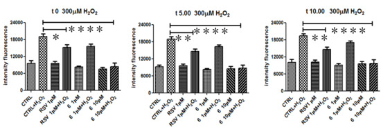 Indeed, the antioxidant activity of compound 6 was also evaluated using an H2DCFDA assay (Figure 6). This assay is one of the most widely used techniques for directly measuring the redox state of a cell [56,57,58]. In order to accurately measure ROS and the cellular capability to counteract the H2O2 insult, we used cell-permeable fluorescent and chemiluminescent probes. The fluorescence intensity is proportional to the ROS levels within the cell cytosol and it is in inverse relation to the antioxidant capacity of the cells themselves. The ability to restore the basal level of fluorescence are reported in Figure 6, after 0.5 and 10 min following oxidant stimulus. During the assays, the cells, after the addition of 300 µM H2O2, can reduce the ROS levels in the presence of RSV and compound 6, compared to the CTRL showing a significant antioxidant activity. In particular, we observed that the oxidant insult, represented by H2O2, was strongly counteracted by the tested compound 6 at 10 μM. This result remains stable throughout the time-course. The compound 6, at this concentration, restoring the fluorescence values close to those of cells without H2O2, showed a significantly higher antioxidant capacity with respect to RSV. These results confirmed the high antioxidant capacity of the new synthesized compound against two ROS harmful to cellular life. Moreover, compound 6 showed potentially greater protective properties respect to RSV; these data suggest that it could be a novel candidate for in vivo studies to further investigate its effects in those pathologies characterized by oxidative stress.