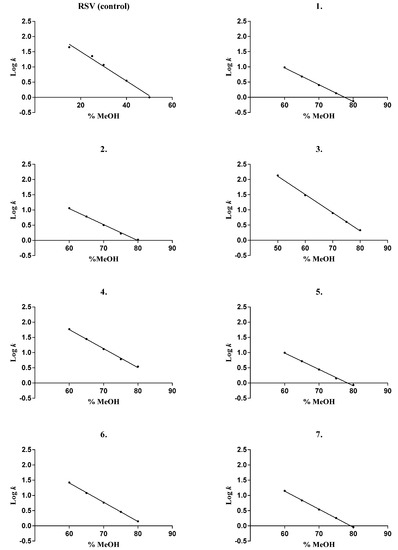 Linear regression correlation between % MeOH and Log k for (1–7) and RSV.