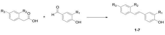 The synthesis of compounds 1–7 was carried out following reported procedures [16,47]. The proper 4-hydroxybenzaldehyde and the suitable aryl acetic acid were mixed in the presence of piperidine at 130 °C. The usual aqueous work-up and purification using silica gel column chromatography produced the phenols 1–7. The synthetic route is in Scheme 1 (see Section 3, Materials and Methods for the detailed procedures).