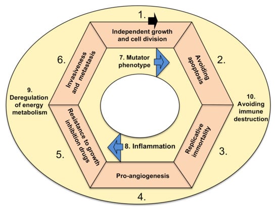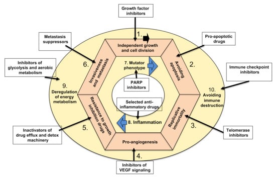 The hallmarks are characterized by the following functional categories: (1) sustaining proliferative signaling, leading to independent growth, (2) resisting cell death (i.e., downregulation of apoptosis), (3) cellular immortalization (prolonging telomeres, enabling cell replication in perpetuity), (4) induction of angiogenesis, (5) resisting conventional therapies that include drugs as suppressors of growth, (6) invasive spreading with metastasis, (7) increased genetic/epigenetic instability (and attaining mutator phenotype), (8) tumor-promoting inflammation (as a growth-stimulating factor), (9) deregulation of energy metabolism in order to acquire more energy for growth (including metabolic shift from oxidative to anaerobic glycolysis) and (10) escaping destruction by the immune system [2]. The ten hallmarks are depicted in Figure 1. There is a hypothesis that various tissue types of cancer depend on particular combinations of genetic/epigenetic changes within the ten hallmarks. The drugs used in cancer therapies that can target and interfere with the ten hallmarks of cancer are elaborated below, firstly from the historic perspective of approval for therapy and secondly through their mode of action.
