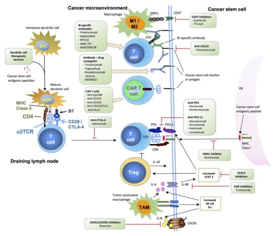 In the latter case, and in more detail, cancer forms a distinct tumor microenvironment, in which cancer stem cells (CSC) are tumor-(re)generating cells. Cancer stem cells exhibit self-renewal and multilineage capacities. CSCs divide, and a part of their progeny differentiates, while some CSCs mutate further, evolving into more invasive kinds of CSCs until they spread to the surrounding tissue and ultimately metastasize [4,5]. Thus, in solid cancers, other stromal cells like cancer fibroblasts are derived in major part from cancer stem cell. However, part of the cancer includes normal cells that have migrated there, like tumor-infiltrating lymphocytes, macrophages, vascular epithelium or fibroblasts [6]. Despite seeming normal, under the influence of cancer cells and the tumor microenvironment, cells from other parts of the body and outside the tumor mass begin to “behave” abnormally and perhaps might not have mutations in genes as CSCs in order to become a part of that particular cancer. Such could be the fate of many endothelial cells and fibroblasts, in general. We see also that lymphatic vessels can only be detected outside the tumor mass, probably because, inside solid tumors, they become “something else”. CSCs are considered resistant to chemotherapy or radiation, both of which can destroy other non-stem-cell tumor cells (and most cells from other parts of the body). CSCs are first described in myeloid leukemia [7,8] and thereafter in solid tumors [9,10]. CSCs’ roles were assessed in animal models [11] and by studying their transcriptional profiles [12]. CSCs resemble embryonic stem cells and induced pluripotent stem cells by expressing similar sets of transcription factors [13,14]. It is thought that CSCs are made by the accumulation of genetic/epigenetic changes until they achieve the ability to self-renew, produce differentiated progeny and develop resistance to therapy. Alternatively, CSCs could be formed by reprogramming from a differentiated cell of a tissue at some point in the life of an individual [15]. CSCs have a fundamental role in providing cancers with resistance to treatment, resurgence and metastasis. CSCs employ cell-signaling molecules in the Hedgehog, Wnt and Notch pathways, and drugs targeting these pathways showed encouraging results in experiments with multiple types of cancer [16,17]. Therefore, targeting CSCs could be a promising strategy for anticancer therapy [18].