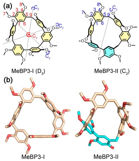 MeBP3 contains three 2,2′,4,4′-tetramethoxyl biphenyl sidewalls and three methylene linkers, which is structurally similar to those synthetic macrocyclic arenes like calix[n]arenes [,,,,], resorc[4]arene [], cyclotribenzylene [], pillar[n]arenes [,,] and other biphen[n]arenes [,,,,,,]. Theoretically, there are two representative conformations for MeBP3, due to flipping of the biphenyl sidewalls (Figure 1a, MeBP3-I and MeBP3-II). For MeBP3-I, three biphenyl units are arranged in the same orientation, and flipping of one biphenyl panel of MeBP3-I can produce MeBP3-II []. Conformer MeBP3-I has D3 symmetry and thus should give rise to two singlets in 1H NMR for their aromatic signals. Conformer MeBP3-II has C2 symmetry and six singlets in the aromatic regions. If the exchanges between two conformers are slow on the NMR timescale, we can differentiate them in the NMR spectra of MeBP3.