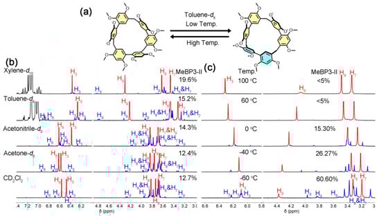Variable-temperature 1H NMR spectra were also examined in different solvents. At relatively high temperatures (≥50 °C), only signals for MeBP3-I were observed in all selected solvents (Figure 3c, Figures S11–S16 and Table S1), suggesting that MeBP3-I is more thermodynamically stable than MeBP3-II. Decreasing the temperatures of MeBP3’s toluene-d8 solution from 100 °C to −60 °C led to gradual transformations of the chemical equilibrium (Figure 3c). For example, at 25 °C, the percentage of MeBP3-I was 85%, while the percentage of MeBP3-II was 61% at −60 °C. That is, in low polarity solvent of toluene-d8, the chemical equilibrium leaned toward the MeBP3-II at low temperatures. However, at high temperatures, MeBP3-I was the dominant species (Table S1). In contrast, in mid-polarity solvents such as CDCl3, CD2Cl2, acetone-d6 and acetonitrile-d3, MeBP3-I was always the main conformer (Table S1). One possible reason is that the temperature-triggered conformational exchange is a solvation-driven process, CDCl3, CD2Cl2, acetone-d6 and acetonitrile-d3 can solvate MeBP3, thereby freezing the changes of chemical equilibrium [].