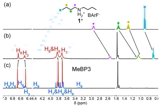 Partial 1H NMR spectra (500 MHz, 25 °C, 2.0 mM) of 1+ (a), host-guest 1:1 mixtures (b), and MeBP3 (c) in CDCl3.