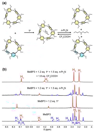(a) Influence of guest-binding and acid/base addition toward conformational exchanges. (b) Partial 1H NMR spectra (400 MHz, −60 °C, 2.0 mM) of MeBP3 in toluene-d8 solution with different conditions.