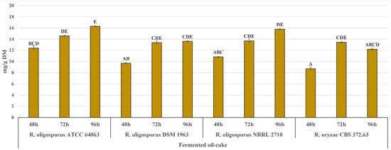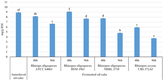Fungal activity also caused a gradual decomposition of inositol phosphates in pumpkin oil cake. In this case, the greatest changes were obtained with the use of the R. oryzae strain, resulting in a 34% (48-h fermentation) to 58% (96-h fermentation) reduction, as compared to the non-fermented material.