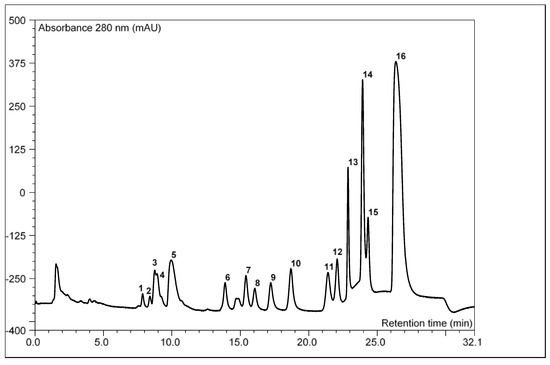 Exemplary high-performance anion-exchange chromatography (HPAEC) chromatogram of inositol phosphate profile of fermented pumpkin oil-cake (48-h fermentation with Rhizopus oligosporus ATCC 64063). 1—Ins(2,4,6)P3; 2—InsP3; 3—InsP3; 4—Ins(2,4,5);(1,4,5)P3; 5—InsP3; 6—InsP4; 7—InsP4; 8—InsP4; 9—InsP4; 10—InsP4; 11—Ins(2,4,5,6)P4; 12—Ins(1,2,3,4,6)P5; 13—Ins(1,2,3,4,5)P5; 14—InsP5; 15—DL-Ins(1,2,4,5,6)P5; 16—phytate.