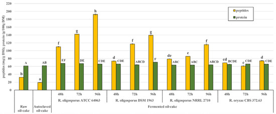 Protein and peptides in pumpkin oil-cake—raw, autoclaved and fermented with Rhizopus strains. One-way analysis of variance and Tuckey post-hoc test were applied. Data is shown as the mean ± SEM. Different letters depict data that differ significantly (p ≤ 0.05) within the parameter.