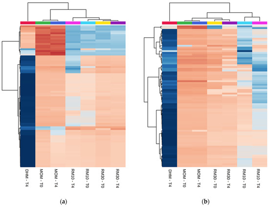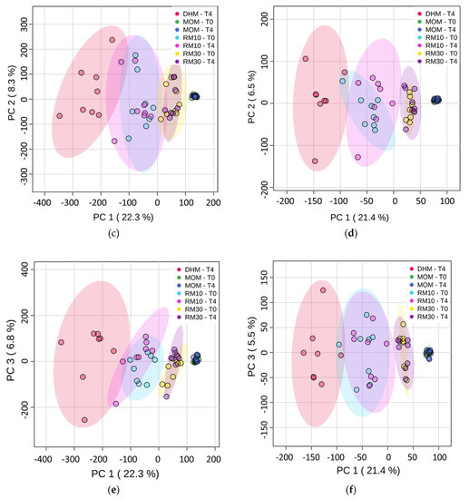 The metabolomics dataset consisted of 6631 features detected between positive and negative ion mode. For this experiment, different batches of DHM were used for each set of DHM/MOM microbial expansion experiments. To minimize the variability contributed by DHM, the concentration of metabolites was normalized within each DHM/MOM/RM10/RM30 set to the corresponding DHM at T0, as well as to the dilution effect of MOM (10% in RM10 or 30% in RM30). Significant differences were found between MOM and DHM metabolite profiles, with RM samples clustering in MOM samples (Figure 1a,b). Principal Component Analysis (PCA) illustrated a clear cluster separation into MOM, RM30, RM10 and DHM samples, which accounted for 22% of the variance seen in metabolites detected on positive and negative ion mode (Figure 1c,d). The feature concentrations in DHM had a larger variability when compared to features in MOM, which clustered in a homogeneous group. The analyses of “non normalized” DHM samples (T0 and T4) showed that the variability observed is due to the heterogeneous nature of the DHM samples and not due to microbial activity during the incubation time (Supplementary Materials Figure S1a). Additionally, while PC1/PC2 allowed the separation into treatment groups (MOM dilutions into DHM), the variance in PC3 was explained by the microbial expansion observed after 4 h of incubation (Figure 1e). Using a PLS-Discriminant Analysis (PLS-DA) it was possible to emphasize group structure and discriminate groups over time in RM30 (Figure S2).