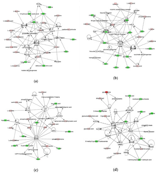 Molecular Networks predicted to be modulated by MOM and RM. The networks were obtained by analyzing the differentially expressed metabolites (Table S3) using IPA. Identified deregulated metabolites involved in the network are represented in green (decrease of concentration) and red (increase of concentration) colors. (a) Network 1: cellular compromise, lipid metabolism, small molecule biochemistry, (b) Network 2: cellular growth and proliferation, (c) Network 3: inflammatory response, and (d) Network 4: nucleic acid metabolism, amino acid metabolism, carbohydrate metabolism, molecular transport.