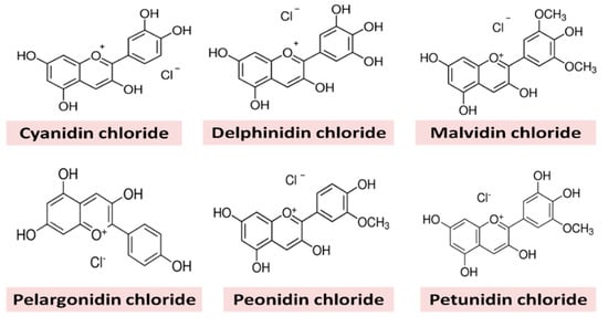 Commonly cultivated wheat (T. aestivum) is amber in color and has a much fewer amount of anthocyanins, but colored wheat varieties (blue, black, purple, and red) of T. aestivum are rich in anthocyanins and other phytochemicals and are becoming popular around the world nowadays [17,18]. Anthocyanin is considered as one of the flavonoids, although it has a positive charge at the oxygen atom of the C-ring of basic flavonoid structure. It is also called the flavylium (2-phenylchromenylium) ion. Anthocyanins are present in glycosylated forms of six anthocyanidins, namely, cyanidin, delphinidin, pelargonidin, peonidin, petunidin, and malvidin (Figure 1). Colored wheat contains a high amount of anthocyanins, which are bioactive compounds with numerous health benefits, including preventing and fighting various chronic diseases such as cancer, cardiovascular diseases, diabetes, inflammation, obesity, aging, liver dysfunction, and hypertension [17,19,20]. Besides this, anthocyanins are also reported to possess a strong antimicrobial activity against different Gram-positive and Gram-negative human pathogens [21,22]. Lacombe et al. [23] demonstrated that anthocyanin-rich American cranberry showed a reduction in the growth of E. coli after treatment with anthocyanin extracts. Red cabbage, sour cherry pomace, and Lonicera caerulea L. (haskap) berries are good sources of anthocyanins and their extracts are used as natural antimicrobial agents to prevent foodborne outbreaks related to E. coli, S. aureus, L. monocytogenes, S. typhimurium, and B. cereus [24,25].