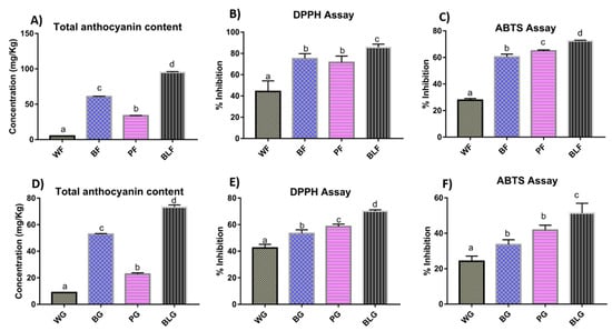 Total anthocyanin content (A,D); and antioxidant potential of wheat flour and wheat-grass juice using DPPH (2,2-diphenyl-1-picrylhydrazyl) (B,E) and ABTS ((2,2′-azino-bis(3-ethylbenzothiazoline-6-sulfonic acid) (C,F) assays. Each bar represents the mean of three replicates ± standard deviation. Significant differences in the bar heights analyzed according to one-way ANOVA. Different letters above bars in each graph represent significantly different values (p < 0.05) designated with a < b < c. Similar letters above the bars represent values being statistically on par. WF—white wheat flour; BF—blue wheat flour; PF—purple wheat flour; BLF—black wheat flour; WG—white wheat-grass; BG—blue wheat-grass; PG—purple wheat-grass; BLG—black wheat-grass.