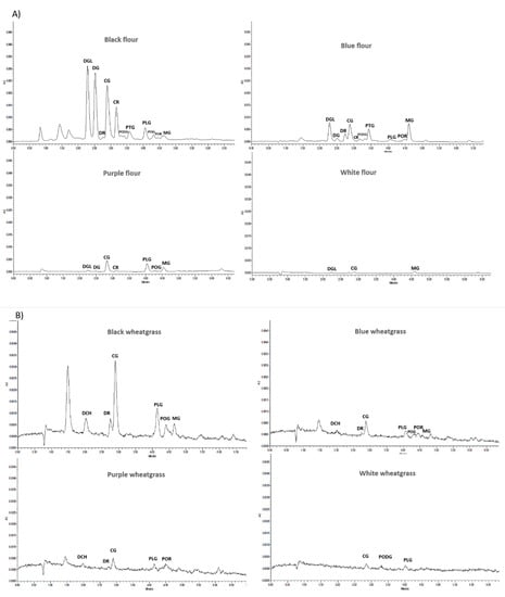 Chromatographs of anthocyanins present in different colored (A) wheat flours and (B) wheat-grass. DGl—delphinidin-3-o-galactoside chloride; DG—delphinidin-3-o-glucoside chloride; DR—delphinidin-3-o-rutinoside chloride; CG—cyanindin-3-o-glucoside chloride; PODG—peonidin-3,5-di-o-glucoside chloride; PTG—petunidin-3-o-glucoside chloride; PLG—pelargonidin 3-o-glucoside chloride; POG—peonidin-3-o-glucoside chloride; POR—peonidin-3-o-rutinoside chloride; MG—malvidin-3-o-glucoside chloride; CR—cyanindin-3-o-rutinoside chloride; DCH—delphin chloride (delphinidin-3,5-di-o-glucoside chloride).