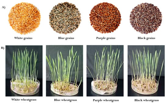 Different colored wheat grains (A); and wheat-grasses (B) used in the present study.