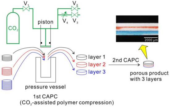 Polymers, especially thermoplastics, are used for many purposes due to their ease of molding [1,2]. However, the fabrication of polymer materials is a process that requires a certain amount of energy for processing, as it involves heating and then cooling. I previously devised the CO2-assisted polymer compression (CAPC) method, in which polymers are plasticized with CO2 and then crimped so that they can be processed without applying heat [3]. Thus, this process is more energy-efficient than the heat-pressing process, and it contributes a key element of the Sustainable Development Goals (SDGs), “Target 9.4: Upgrade all industries and infrastructures for sustainability”, which aims at building sustainable societies [4].